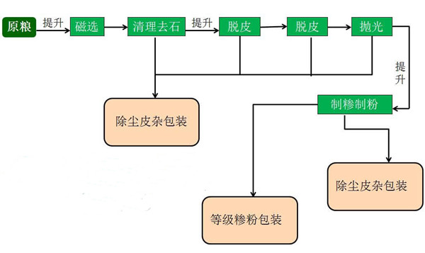 主要設(shè)備:組合清糧機,砂輥脫皮機,鐵輥脫皮拋光機,超精制粉機,超精制糝機,刷粉機
